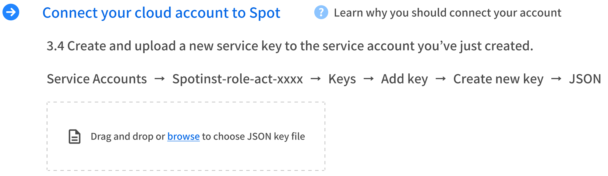Once you have created the key, drag and drop the JSON file to Spot, to the area indicated in the wizard.