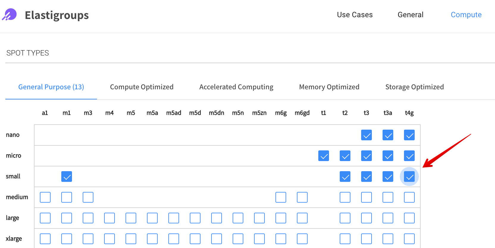 Go to the Compute tab and scroll down to Spot Types. (If you are creating a new Elastigroup, you must complete the required information in the General tab before you can enter the Compute tab.)