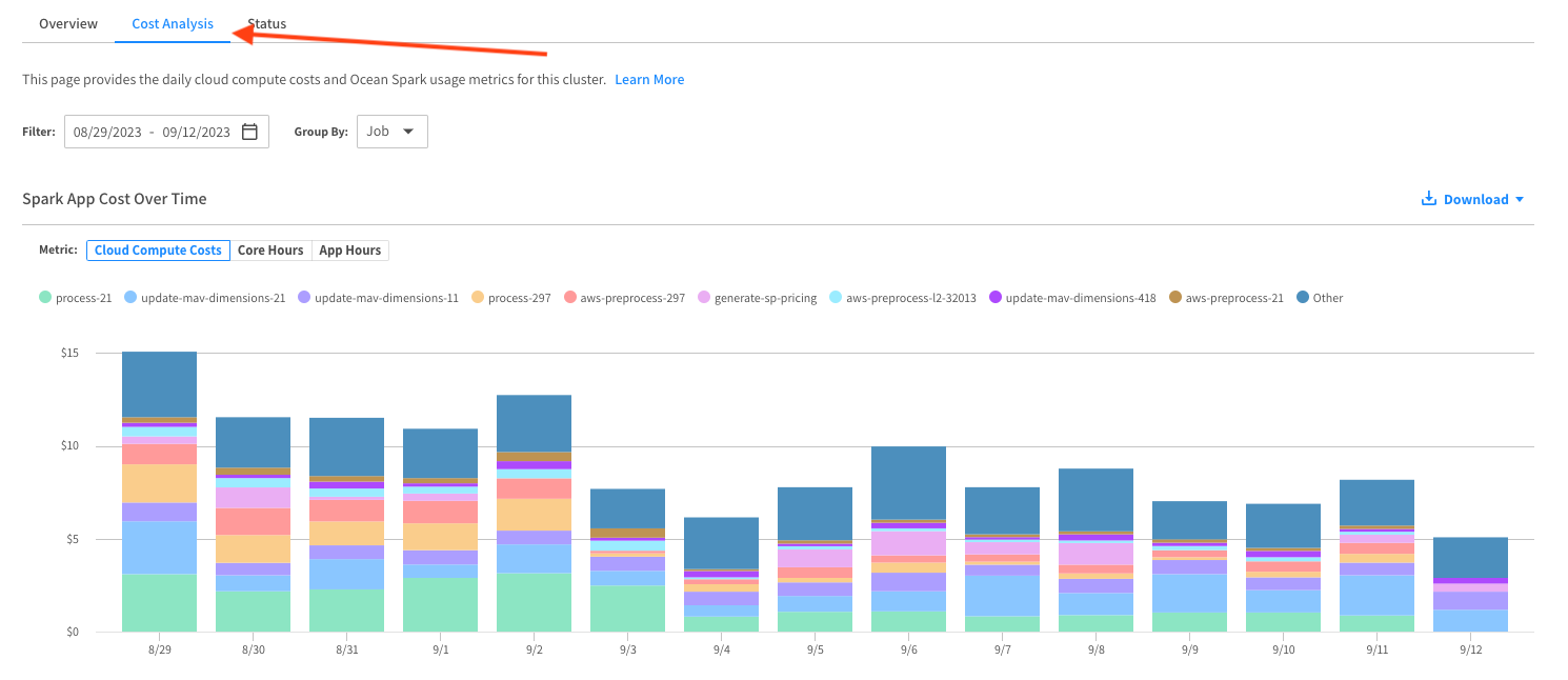 The top part of the cost analysis page is a bar chart showing your Spark application usage metrics on the cluster over time.