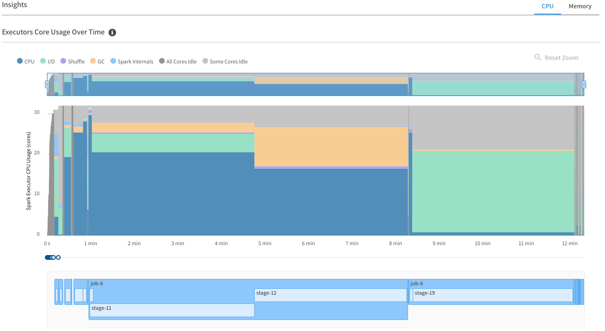 The Insights area gives information about the resource usage of the application over time. The first tab shows executor CPU usage, broken down by categories (CPU, I/O, shuffle, GC, Spark internals). This graph aligns with a timeline of your Spark jobs and stages, so that it's easy to correlate CPU metrics with the code of your Spark application.
