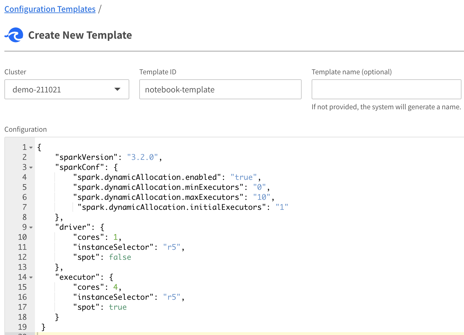 You can use the Spot console or the API to create a Configuration template. Here’s a configuration template example to help you get started: