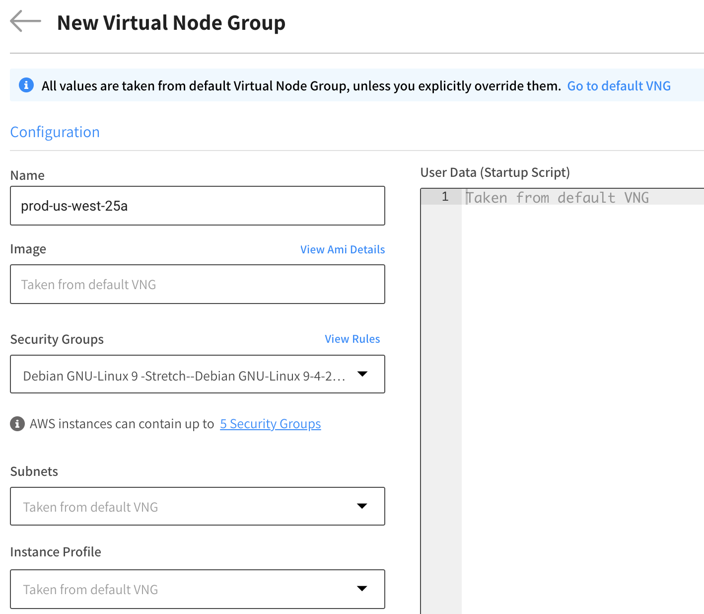 - When the New Virtual Node Group page appears, you will see the fields populated with the values from the Autoscaling Group you chose. Review all of the parameters and update them if necessary.
