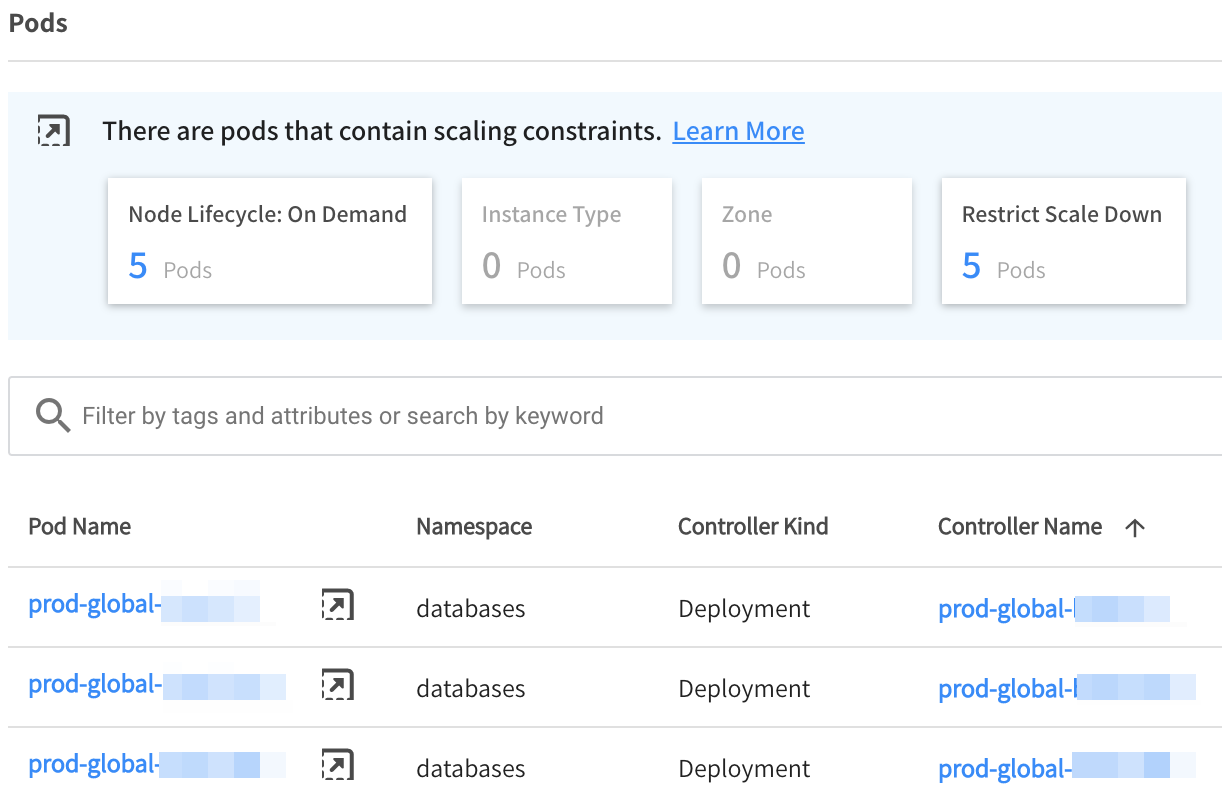 - When the Pods tab opens, a banner at the top indicates if there are constraints on the pods.